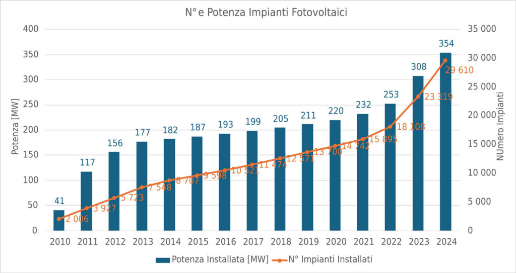 In 2024, according to data from Areti, there were 6219 new solar PV plants installed for a total of 46 Mw, bringing the total installed in Rome to 29610 plants and 354 MW. It is worth noting the growth in the last two years that put Rome among the municipalities with the largest installations.